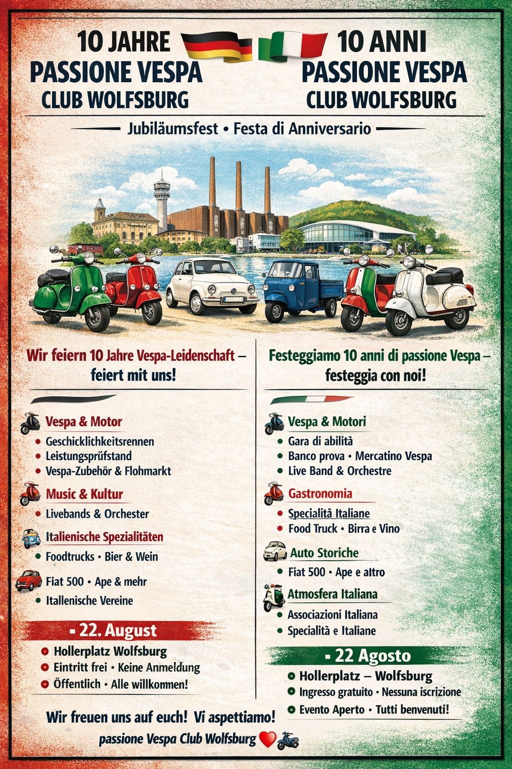 Der Passione Vespa Club Wolfsburg, gegründet Ende Dezember 2016, feiert sein 10-jähriges Jubiläum – und das möchten wir nicht allein tun, sondern mit euch allen!